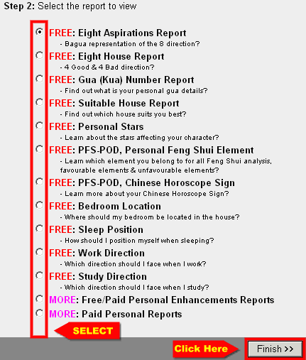 - Next is to select the report to generate. In this case, select the PFS-POD: Personal Feng Shui Element Report and click FINISH.